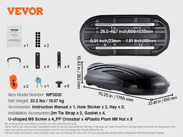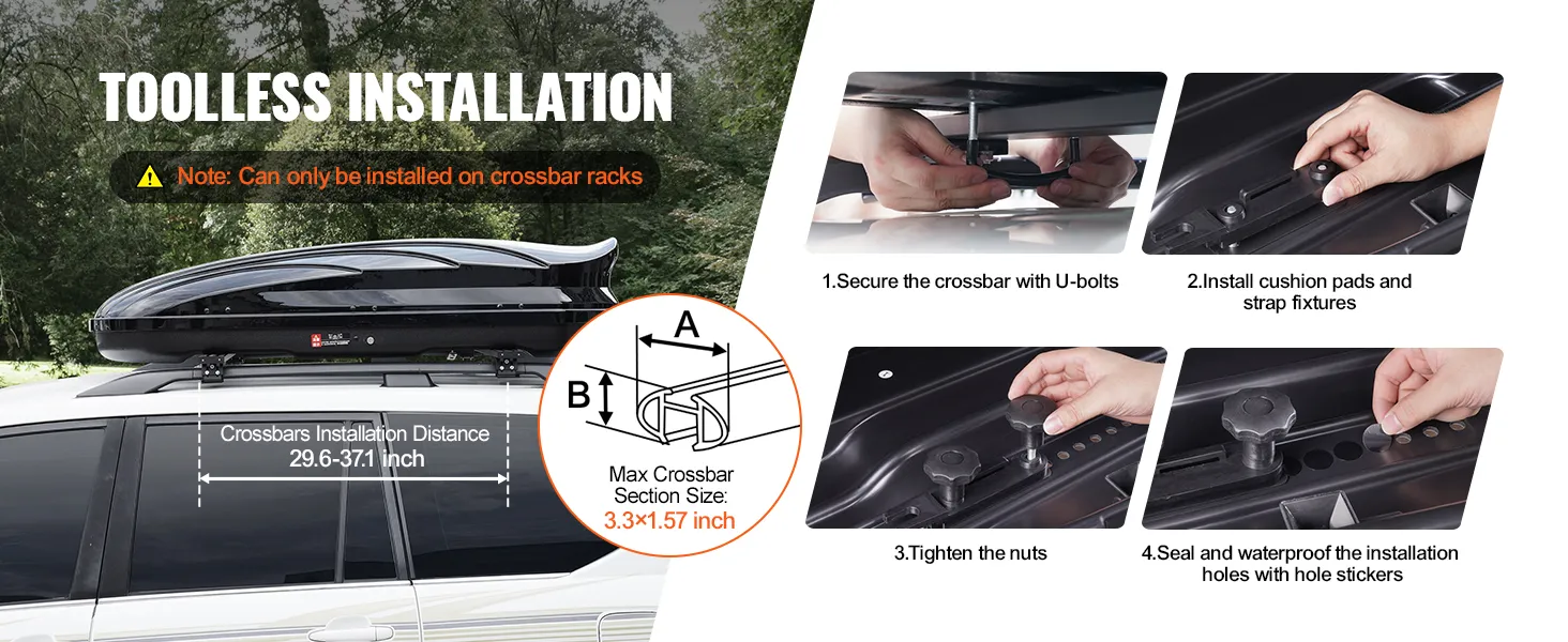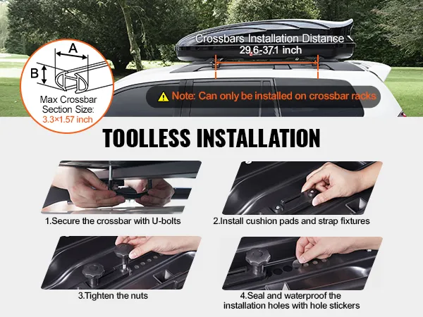 Compatibel met verschillende dwarsbalken: past op montageafstanden van de dwarsbalk van 29,6 tot 37,1 inch (752-943 mm). Inclusief compleet montagegereedschap, boren is niet nodig. Met metalen staven aan de onderkant voor extra stabiliteit.