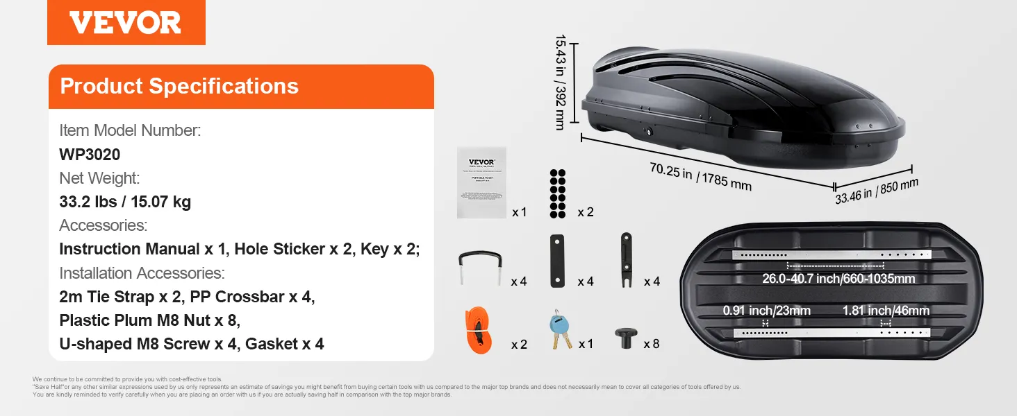 Het wordt aanbevolen om de dakkoffer te selecteren die bij het voertuigmodel past. Zorg ervoor dat de afstand tussen de dwarsbalken overeenkomt met die van de dakkoffer om onbalans te voorkomen en een gelijkmatige gewichtsverdeling te garanderen.
