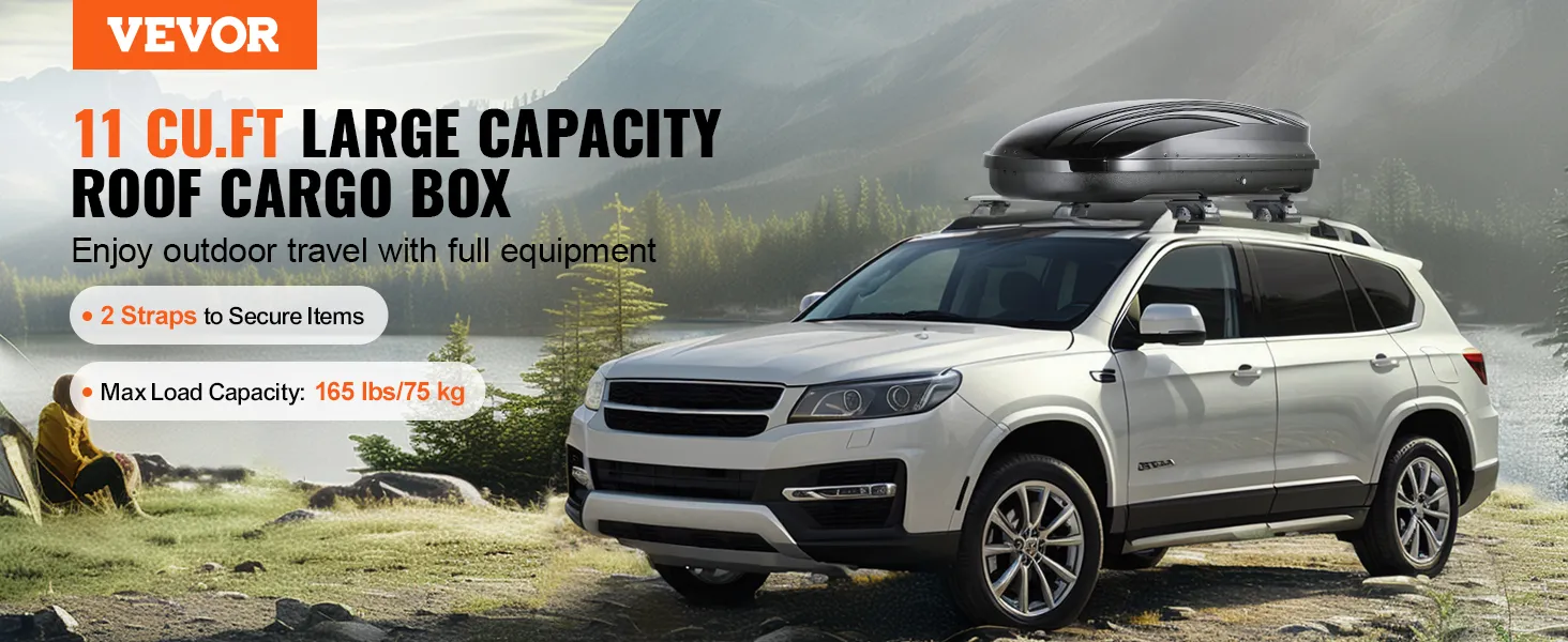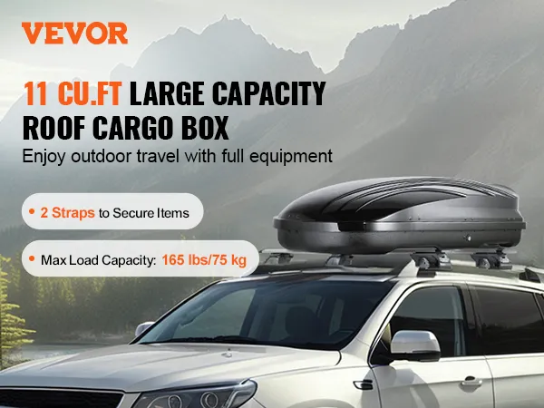 340 L inhoud: De dakkoffer maximaliseert de dakruimte en biedt veel opbergruimte. Hij is ontworpen voor een maximale belasting van 75 kg (165 lbs) en heeft twee bevestigingsriemen om spullen erin vast te zetten.