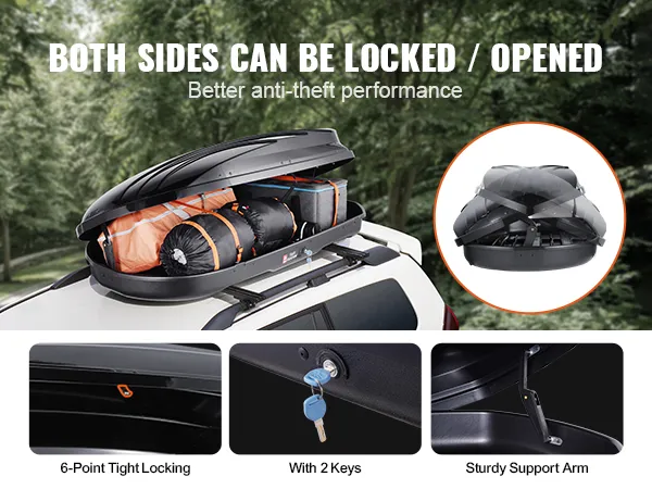 Gemakkelijke toegang tot bagage vanaf beide zijden van het voertuig; Steunarmen houden het deksel open totdat het gesloten is. Let op: Open niet beide pagina's tegelijkertijd. Verwijder de sleutel pas na het sluiten en vergrendelen.