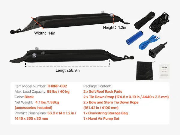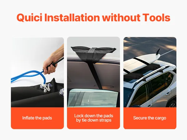• Effortless Installation: No tools required! Simply use the included manual pump to inflate the roof rack pads, and use the 2 tie down straps and 2 bow and stern tie down ropes to secure the universal car roof rack pads to your car roof, quickly and easily fastening your gear in place. And they are easy to store with the provided drawstring storage bag.