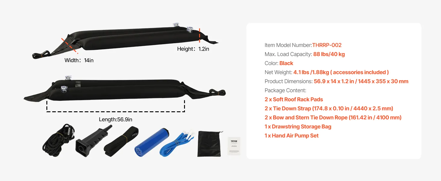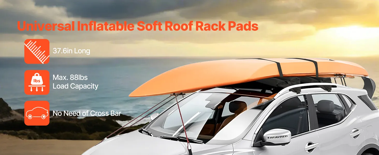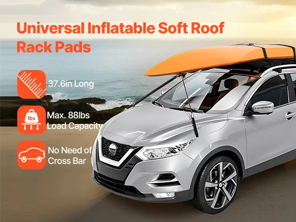 Our inflatable soft roof rack pads are compatible with most vehicles with or without side rails, providing up to 88 lbs load capacity. Crafted from soft yet durable materials, these kayak roof rack pads ensure a secure and reliable solution for transporting kayaks, canoes, SUPs, snowboards, etc.