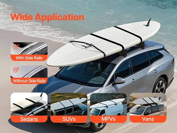 • Universal Fit for Most Vehicles: Compatible with most cars without the need for crossbars, our 37.6-inch inflatable soft roof rack bars fit vehicles with or without side rails. Perfectly suited for popular 2, 3, 4, and 5-door sedans and SUVs, it's a versatile solution for most cars on the road.