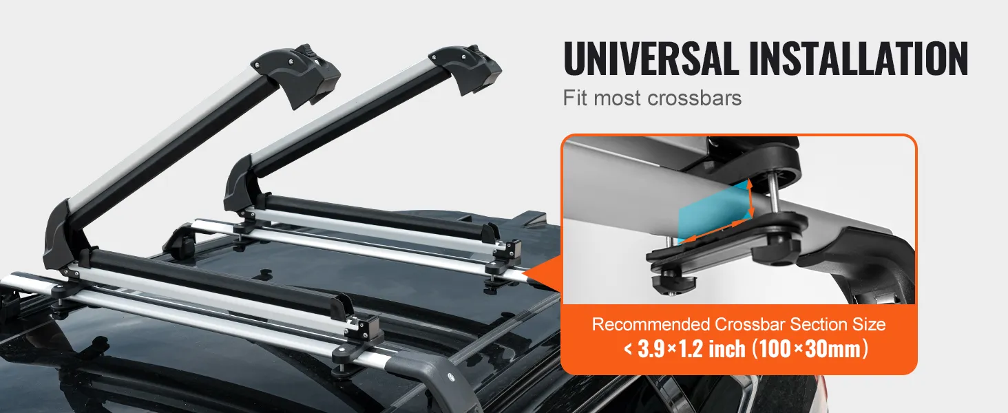 Compatible with various types of crossbar racks, our snowboard rack is easy to mount without drilling, ensuring a hassle-free setup experience. Recommended crossbar section size < 3.9 x 1.2 inch (100 x 30 mm).