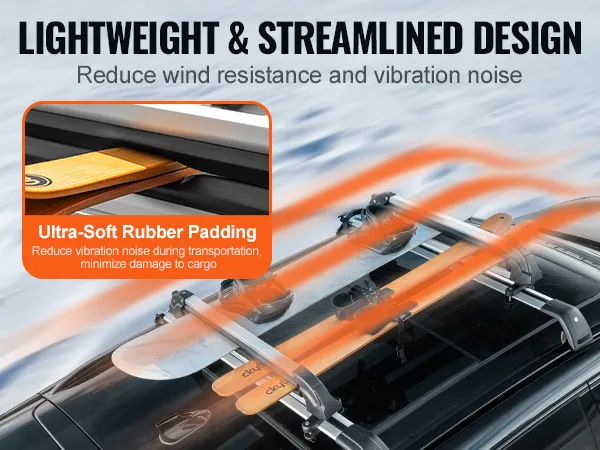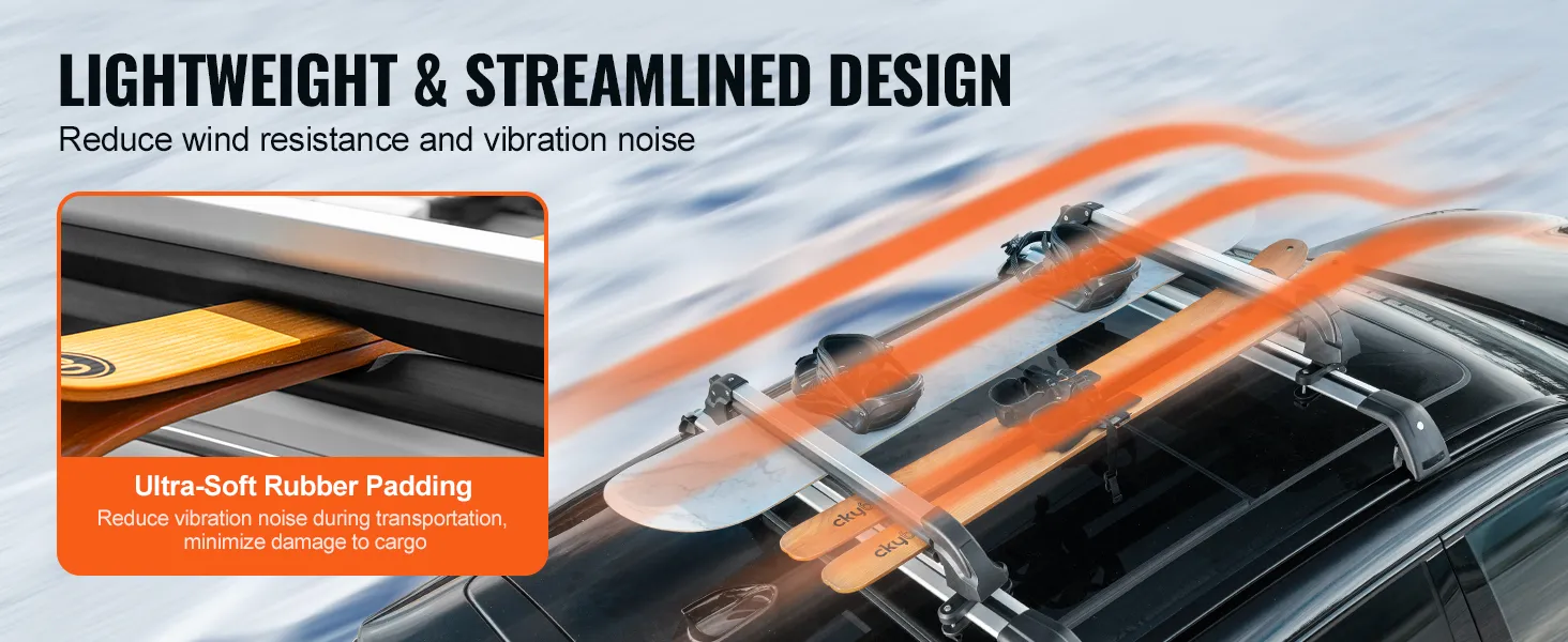 Featuring 22.8-inch extended rubber padding, our universal ski roof rack protects your ski equipment from scratches and reduce vibration noise. The lightweight and streamlined design further enhances performance by reducing wind resistance, ensuring stable transport.