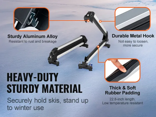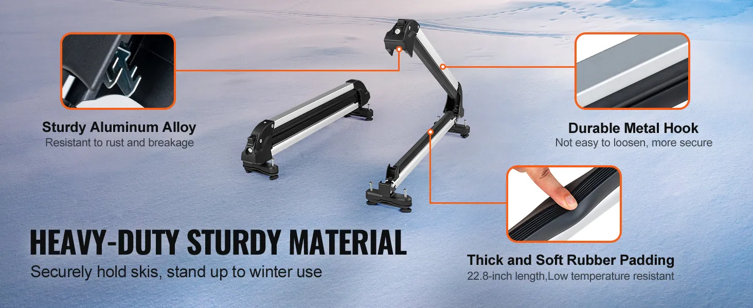 Stability on the Go: Keep your ski equipment secure with VEVOR ski roof rack. Our 22.8-inch extended and thick rubber padding effectively protects your beloved ski board from scratches and reduces vibration noise during transportation, ensuring a smooth and quiet ride.