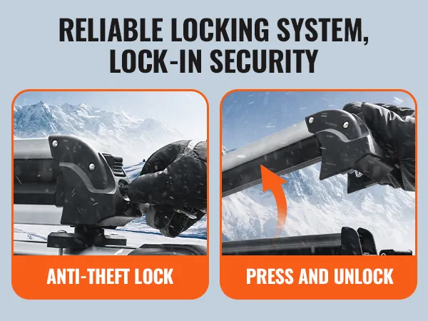 Lock in Security: Our roof rack fishing rod holder comes with an anti-theft lock system and two keys, providing reliable protection against during outdoor adventures. The large button allows for easy locking and unlocking, even with gloves on.
