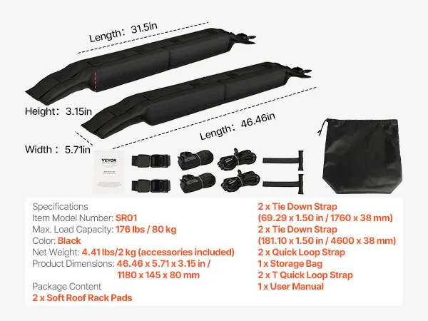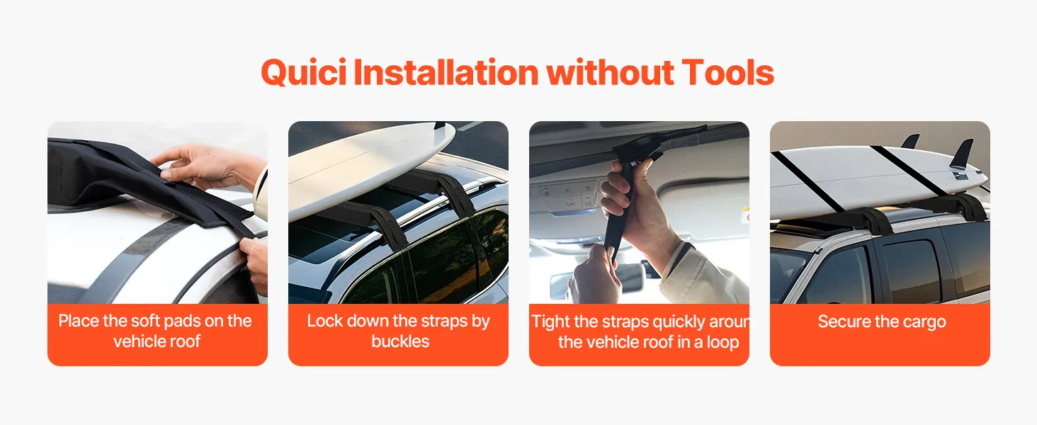 Effortless Installation: No tools required! Simply use the included 4 tie down straps, 2 quick loop straps, and 2 T quick loop straps to secure the soft roof rack pads to your car roof, quickly and easily fastening your gear in place. And they are also easy to store with the provided storage bag.