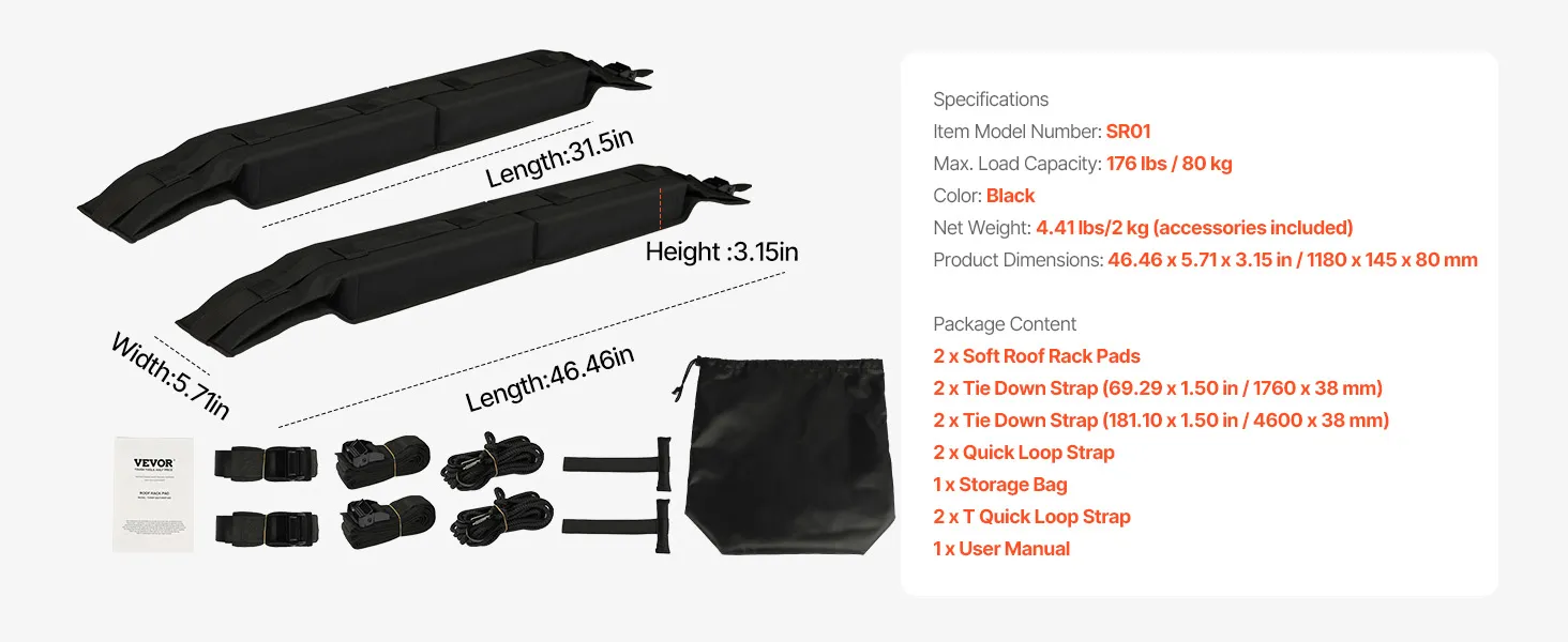 Built to Last: Crafted from strong polyester and PVC materials, these universal roof rack pads for cars are durable, wear-resistant, and waterproof, ensuring long-lasting use. It can hold up to 176 lbs, making it ideal to meet most hauling needs.