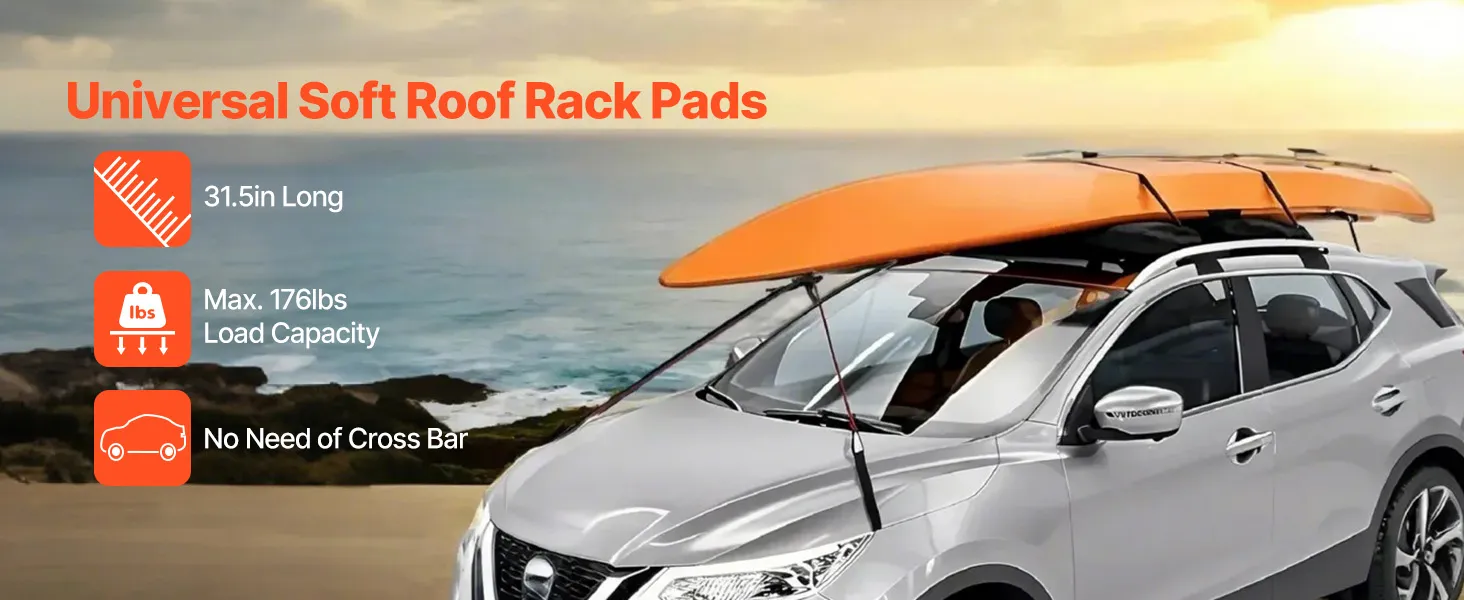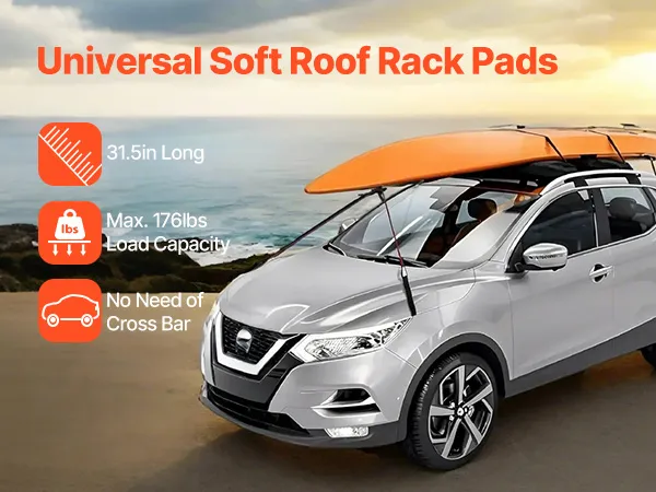 Our 31.5-in soft roof rack pads are compatible with most vehicles with or without side rails, providing up to 176 lbs load capacity. Crafted from soft yet durable materials, these kayak roof rack pads ensure a secure and reliable solution for transporting kayaks, canoes, SUPs, snowboards, etc.