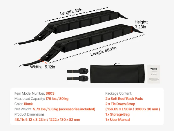Our 33-in soft roof rack pads are compatible with most vehicles with or without side rails, providing up to 176 lbs load capacity. Crafted from soft yet durable materials, these kayak roof rack pads ensure a secure and reliable solution for transporting kayaks, canoes, SUPs, snowboards, etc.
