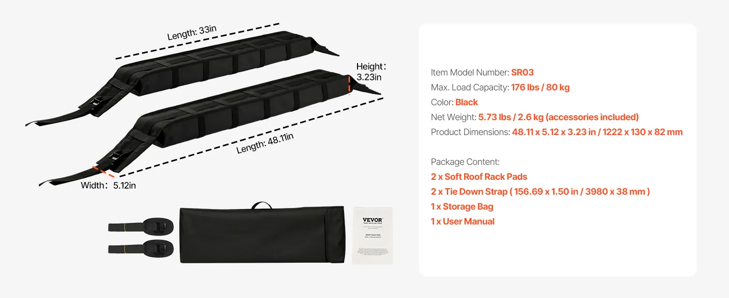 Built to Last: Crafted from strong polyester and PVC materials, these universal roof rack pads for cars are durable, wear-resistant, and waterproof, ensuring long-lasting use. It can hold up to 176 lbs, making it ideal to meet most hauling needs.