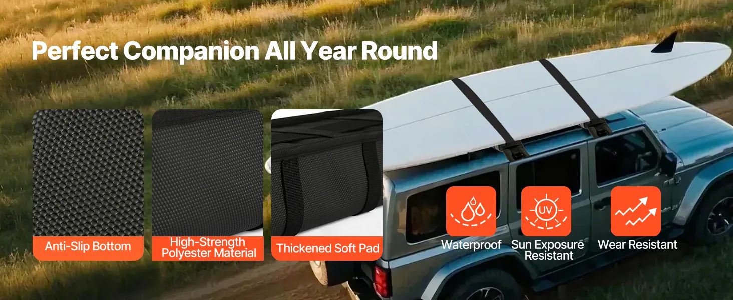 Universal Fit for Most Vehicles: Compatible with most cars without the need for crossbars, our 33-inch universal soft roof rack pads fit vehicles with or without side rails. Perfectly suited for popular 2, 3, 4, and 5-door sedans and SUVs, it's a versatile solution for most cars on the road.