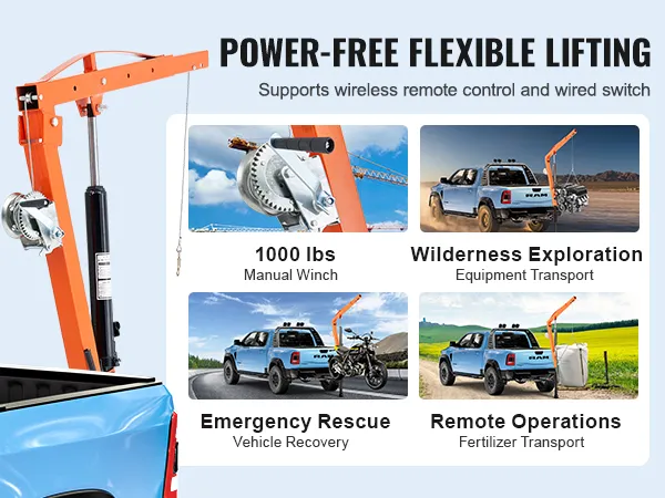 Effortless Manual Control: Say goodbye to complex wiring with our truck bed crane! The hydraulic winch makes lifting a breeze, perfect for vehicle rescue or cargo handling with minimal effort. Ready for any spontaneous or urgent tasks on the go!