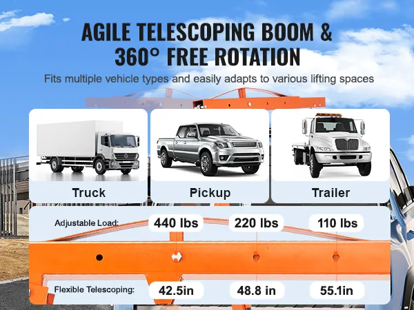 Flexible Telescoping: The boom of our jib crane has a range of 36.22-48.8-55.1 in/0.92-1.24-1.4 m. With 3-level telescoping, it's ready for any height or weight, fitting seamlessly into various vehicles and scenarios.