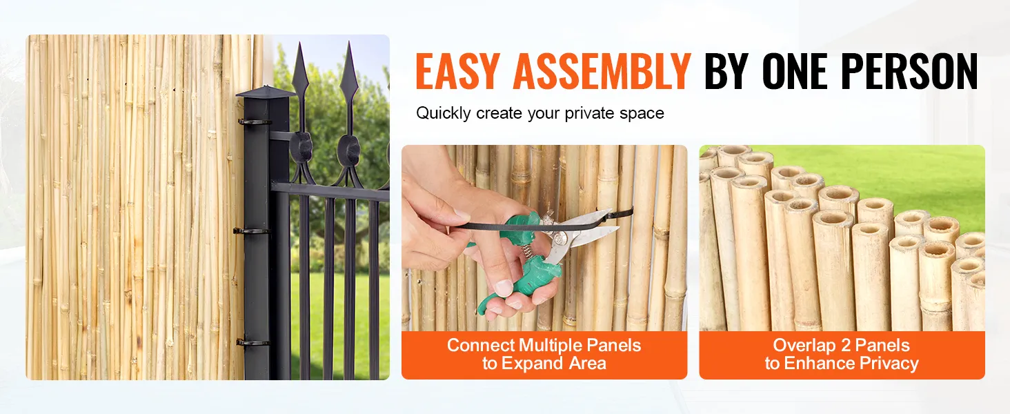 Easy Installation: Simply unpack and attach the bamboo wall panel to any railing or post with suitable fasteners (like zip ties or wire). Easy to set up on flat or curved surfaces, saving time and effort. Please measure your space accurately before purchasing. The fence surface may have minor splinters; we recommend wearing gloves during installation.