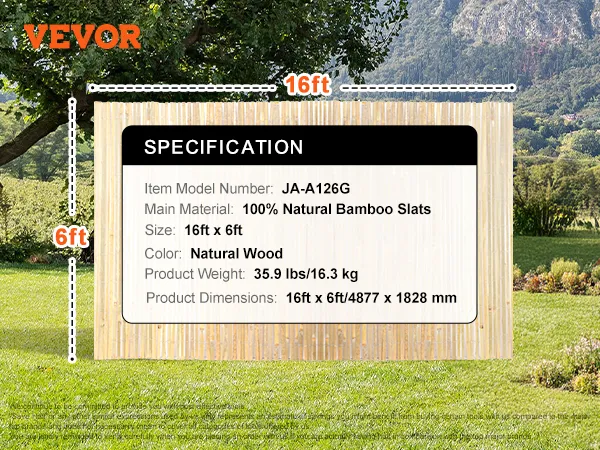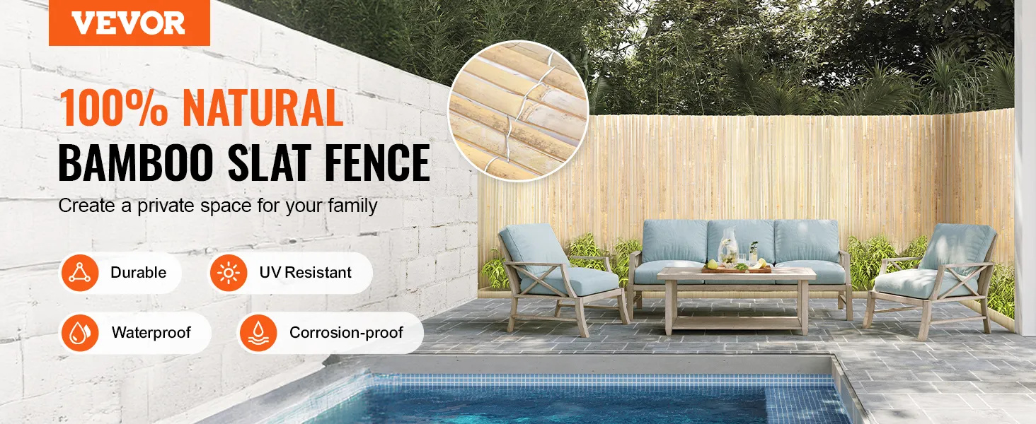 Sturdy and Durable: Each bamboo slat fence piece is secured with heavy-duty galvanized steel wire, ensuring rust resistance and overall strength. The bamboo undergoes heat treatment to enhance its waterproof feature, extending its lifespan. Embrace green living!