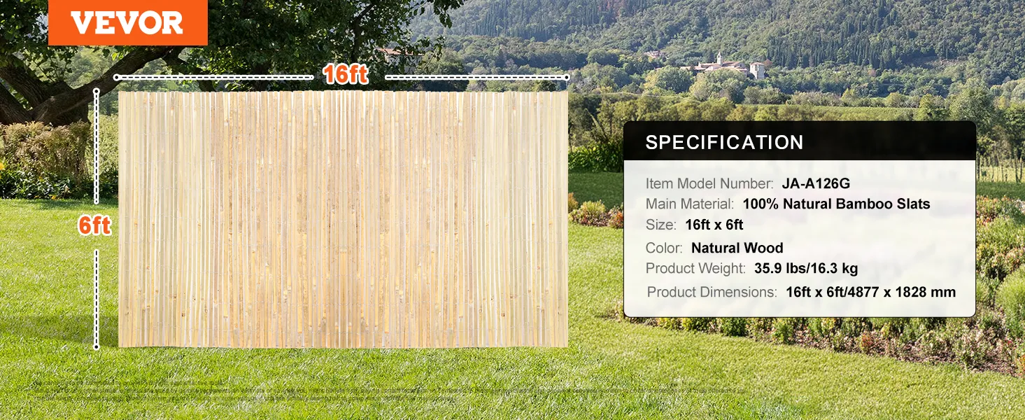 VEVOR Natural Bamboo Privacy Fence Screen, Eco-Friendly Privacy Bamboo Slat Fence, 6 ft H x 16 ft L Decorative Bamboo Screen Panel, for Garden, Backyard, Balcony, Patio, Pool Side