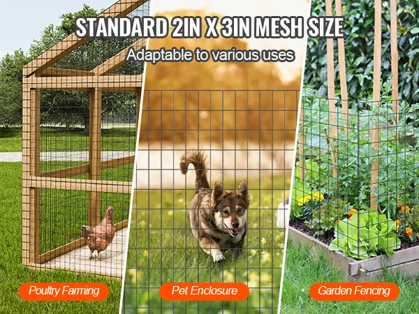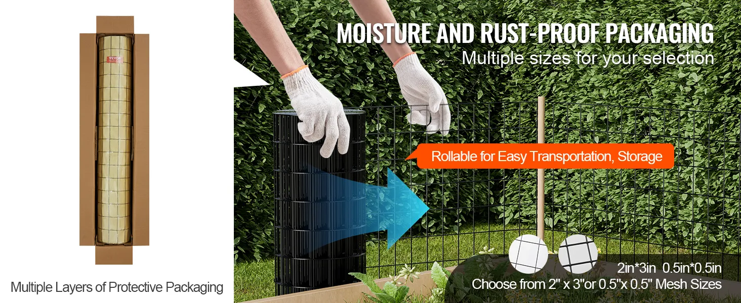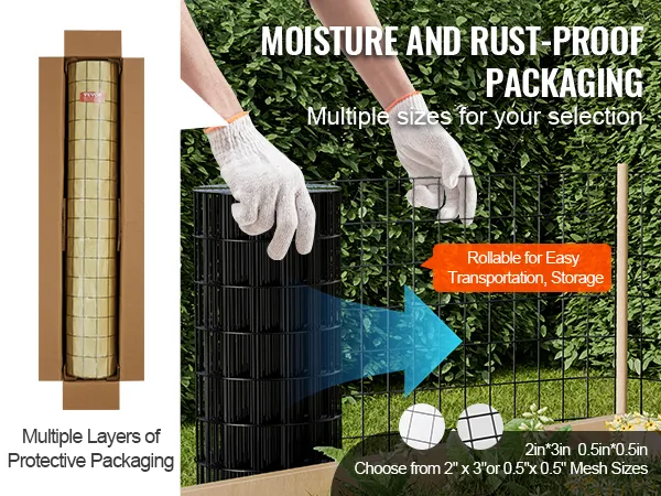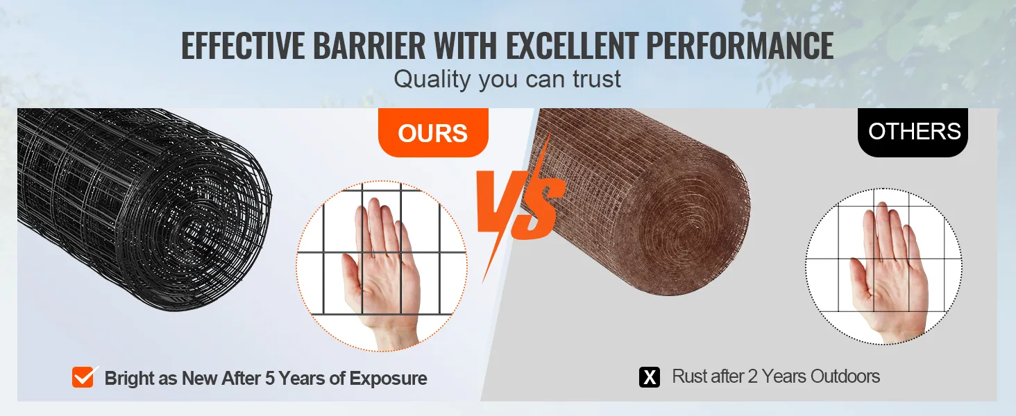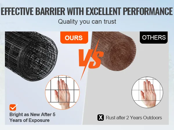 Effectieve bescherming: met een maaswijdte van 2 x 3 inch biedt de draadgaasrol een veilige bescherming voor dieren en planten. Het is waterdicht, roestbestendig, corrosiebestendig, scheurbestendig en heeft een glad, aantrekkelijk oppervlak dat zijn integriteit behoudt, zelfs in zoute omgevingen.