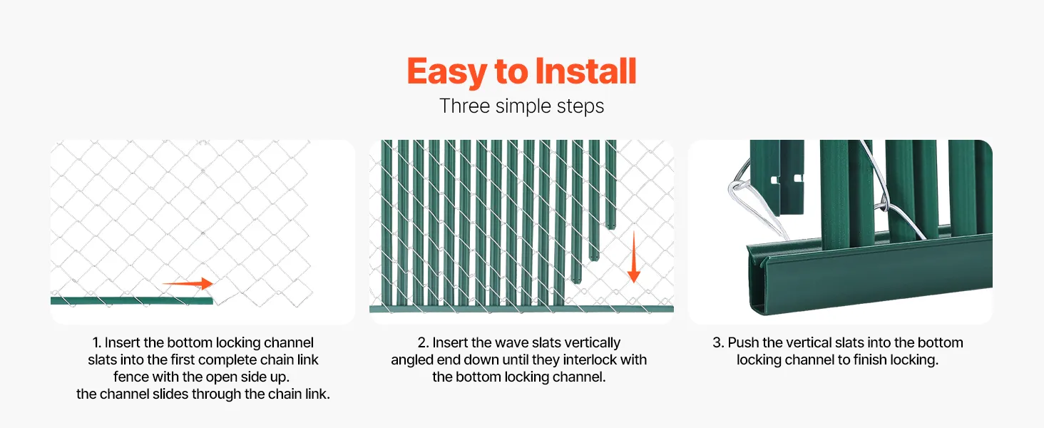 The bottom locking privacy slats require just three simple steps. First, insert the bottom locking channel slats into the fence base. Then, slide the privacy slats vertically down and lock them into the bottom channel. You can easily complete the fence installation.