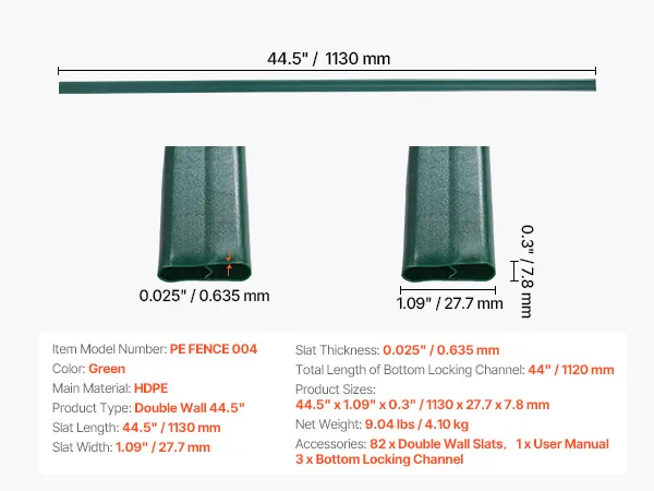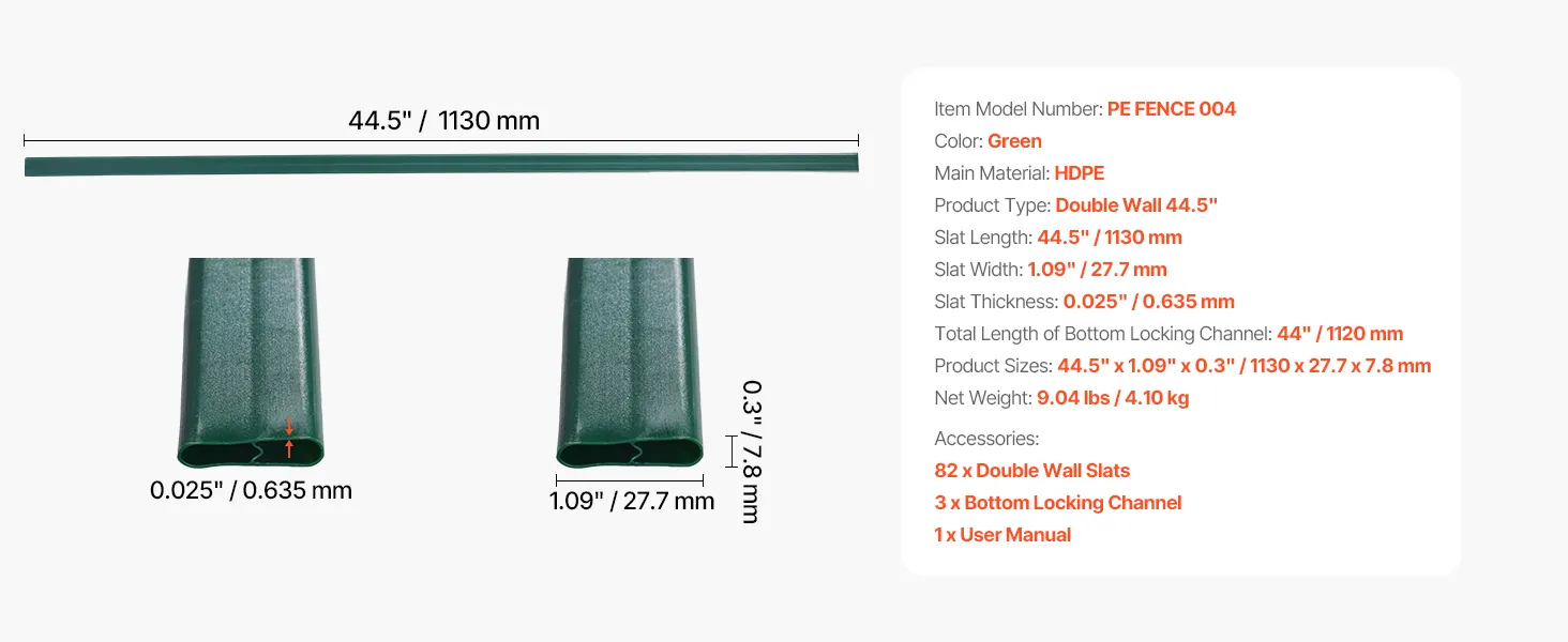 Double-Wall Privacy Slats: Designed specifically for 4' high fences, these bottom locking privacy slats are approximately 44.5" in length, ensuring a ideal fit and avoiding slats from extending above the fence top.