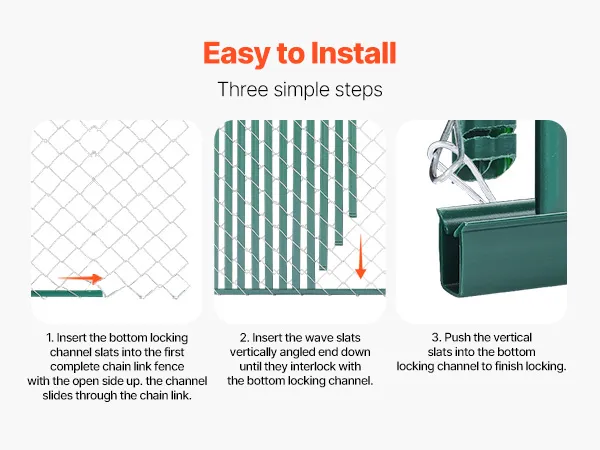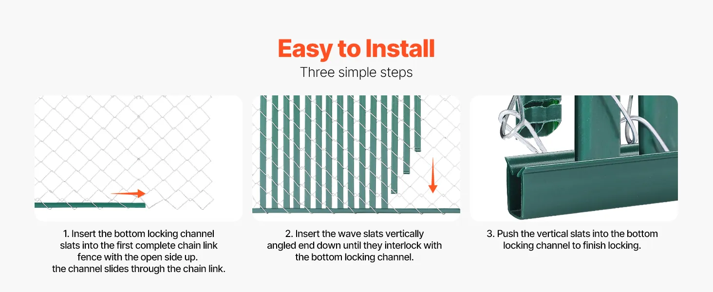 The bottom locking privacy slats require just three simple steps. First, insert the bottom locking channel slats into the fence base. Then, slide the privacy slats vertically down and lock them into the bottom channel. You can easily complete the fence installation.