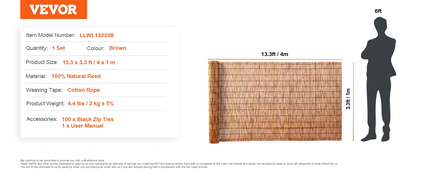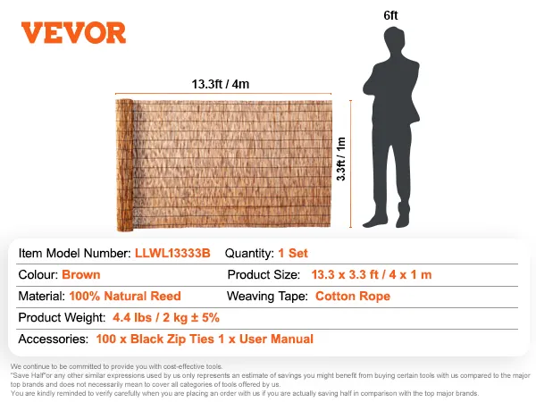 Easy Installation: This kit includes one natural reed fence panel (13.3 x 3.3 ft) and 100 zip ties. One person can easily attach the fence to any rail or post. Make sure to measure your space accurately before buying. For a smooth installation, we recommend wearing gloves as there might be slight burrs on the surface.