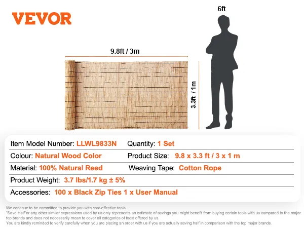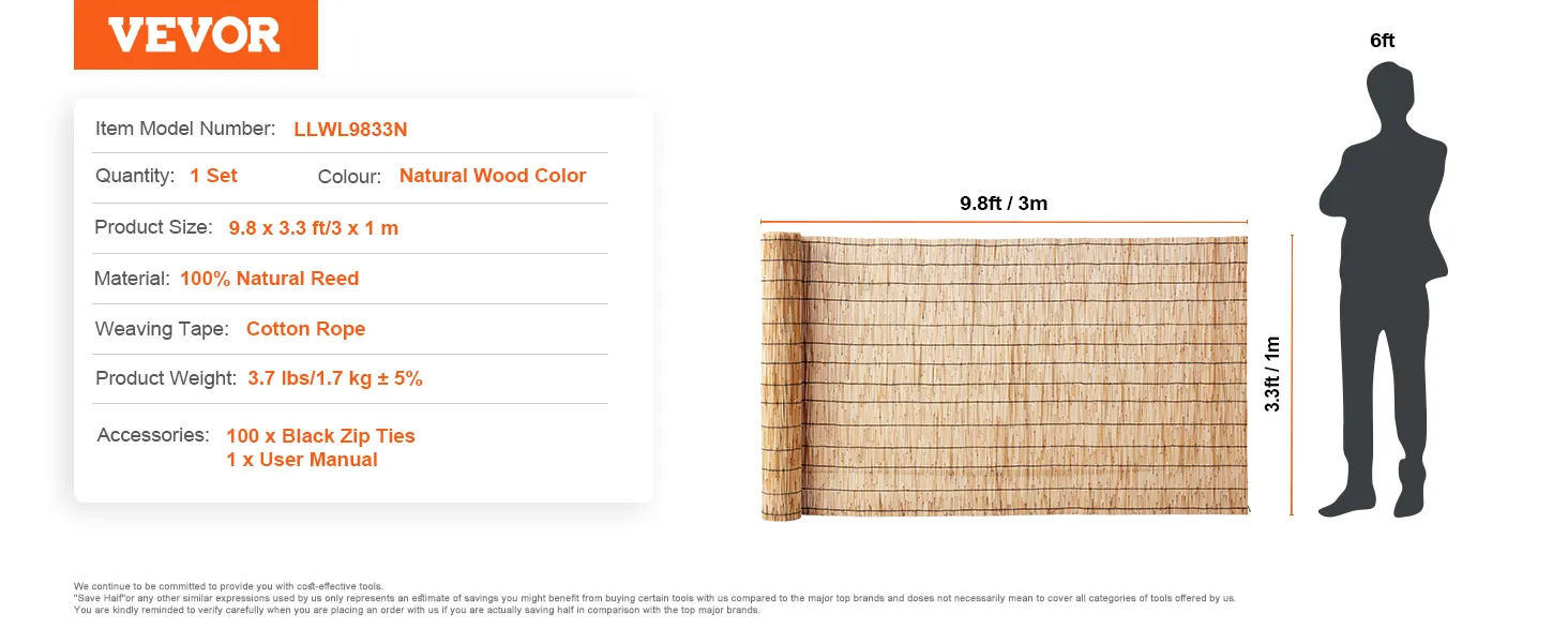 Eenvoudig te installeren: deze set bevat een schuttingpaneel van natuurlijk riet (3,9 x 1,0 m) en 100 kabelbinders. Eén persoon bevestigt het hekwerk eenvoudig aan elke leuning of paal. Zorg ervoor dat u uw ruimte zorgvuldig meet voordat u koopt. Voor een vlotte installatie raden wij aan handschoenen te dragen, aangezien er lichte bramen op het oppervlak kunnen voorkomen.