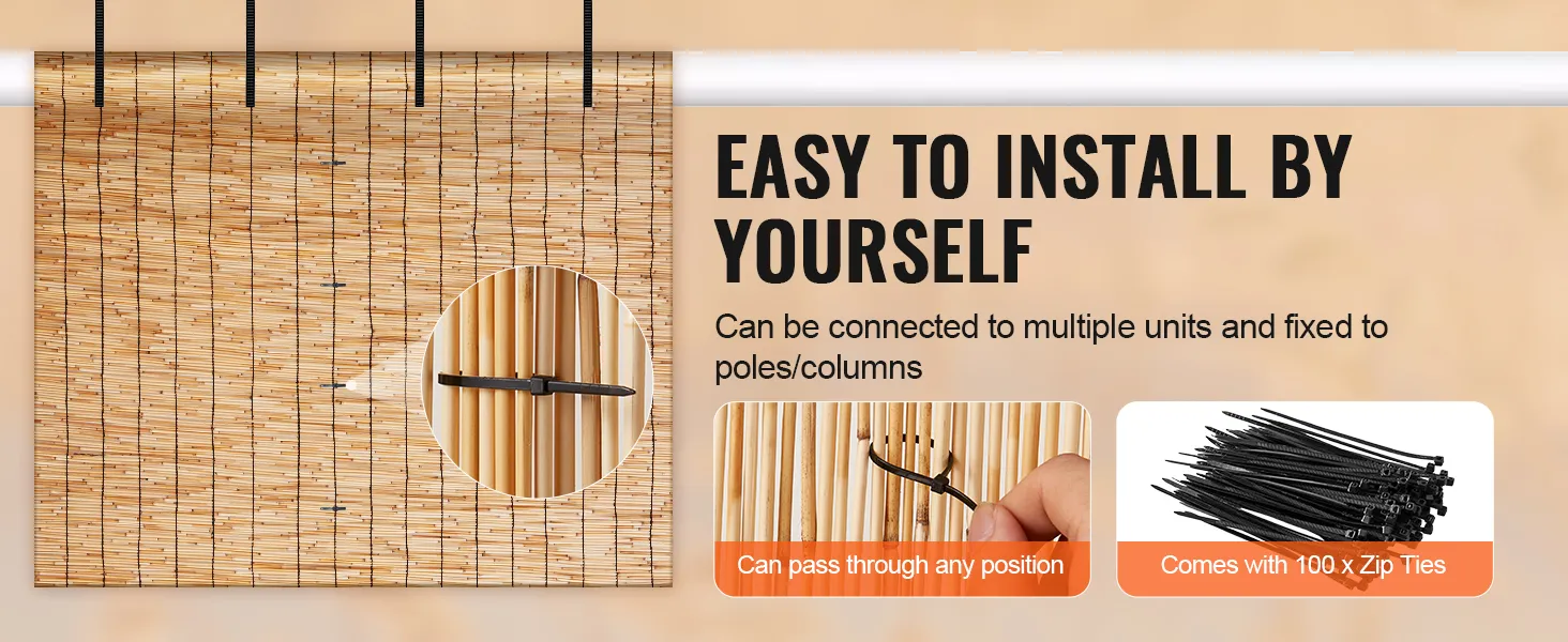 Het installeren van ons rieten privacyscherm is kinderspel. Je hebt geen hamers of gereedschap nodig - gebruik gewoon de meegeleverde kabelbinders en je bent klaar!