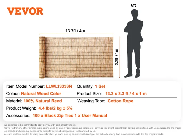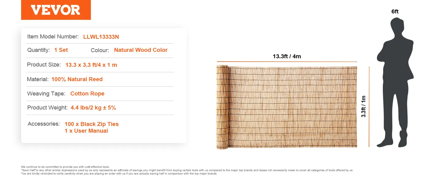 Eenvoudig te installeren: deze set bevat een schuttingpaneel van natuurlijk riet (4,1 x 1,0 m) en 100 kabelbinders. Eén persoon bevestigt het hekwerk eenvoudig aan elke leuning of paal. Zorg ervoor dat u uw ruimte zorgvuldig meet voordat u koopt. Voor een vlotte installatie raden wij aan handschoenen te dragen, aangezien er lichte bramen op het oppervlak kunnen voorkomen.
