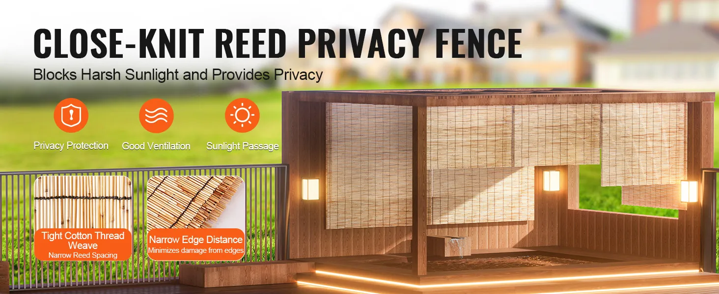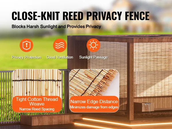 Geniet van uitstekende privacy met dicht opeengepakte rieten geweven met katoenen draad. In tegenstelling tot draad ziet katoenen draad er natuurlijker en eleganter uit en laat het geen roestvlekken achter op het rieten hek.