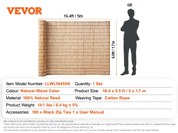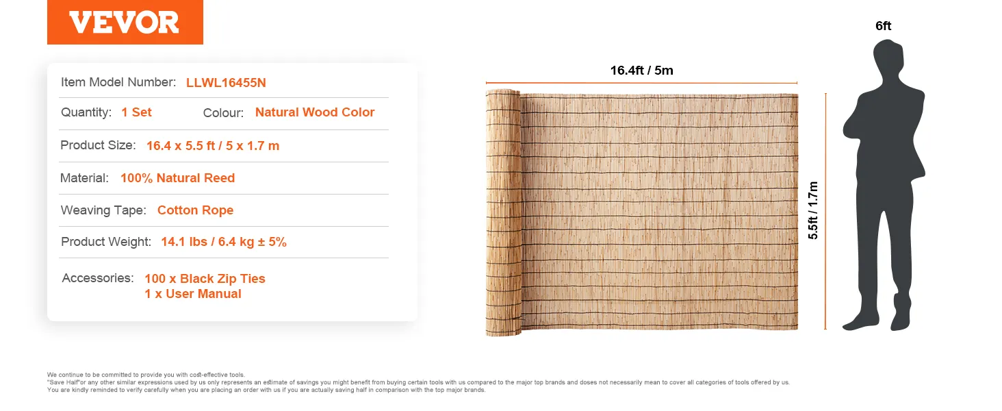 Easy Installation: This kit includes one natural reed fence panel (16.4 x 5.5 ft) and 100 zip ties. One person can easily attach the fence to any rail or post. Make sure to measure your space accurately before buying. For a smooth installation, we recommend wearing gloves as there might be slight burrs on the surface.