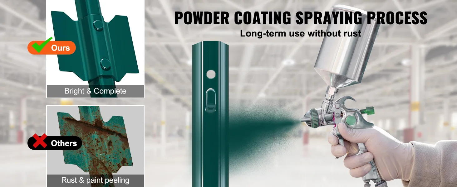 Stabiele en duurzame hekpaal: deze hekpaal is gemaakt van 2 mm/0,08 inch dik Q235 koolstofstaal, wat een hoge sterkte en stijfheid biedt. Het U-vormige kanaalontwerp verbetert de buigsterkte, terwijl de poedercoating UV-bescherming en corrosiebestendigheid biedt, waardoor duurzaamheid onder alle weersomstandigheden wordt gegarandeerd.