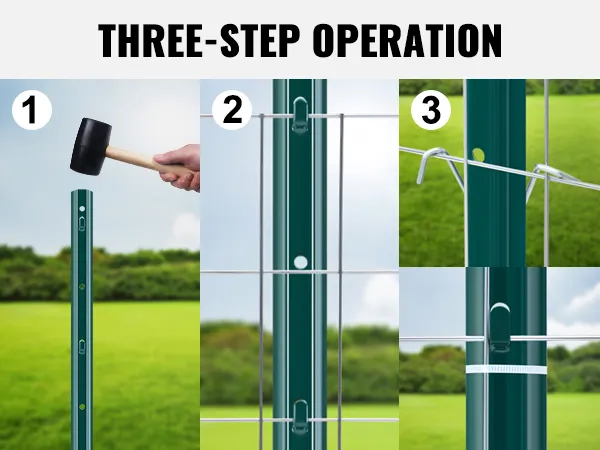 Easy Installation: Simply drive the post into the ground using a hammer or post driver until the anchor plate is below the surface. Installation is quick and straightforward. Additional zip ties and metal clips are included to further secure the fence structure.
