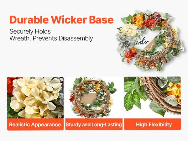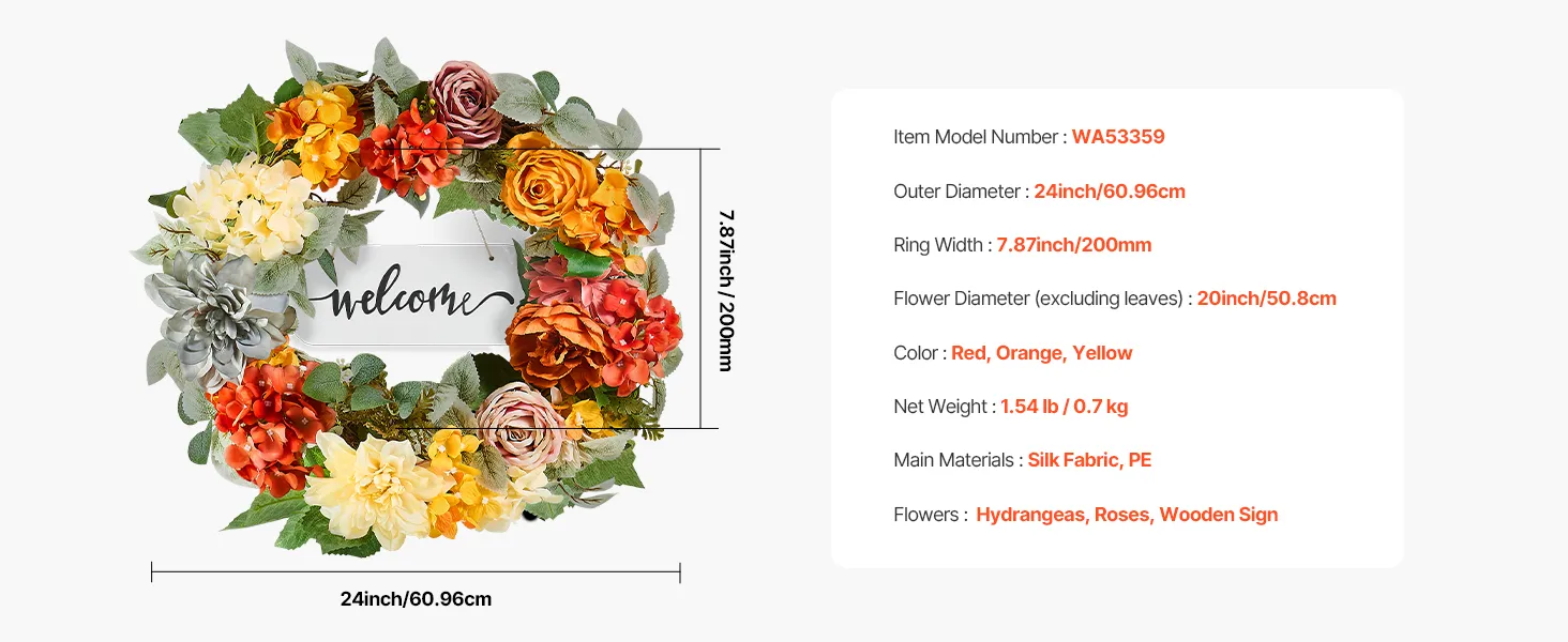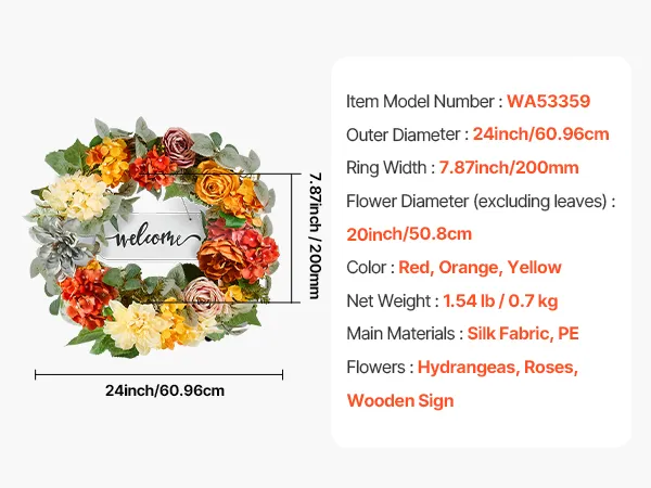 VEVOR Kunstmatige decoratieve krans, 60,96 cm, rood, oranje, geel, versierd met hortensia's, rozen, houten bord, krans voor alle seizoenen, deurkrans, seizoenskrans, binnen en buiten, huismuur, raam, vakantiedecoratie