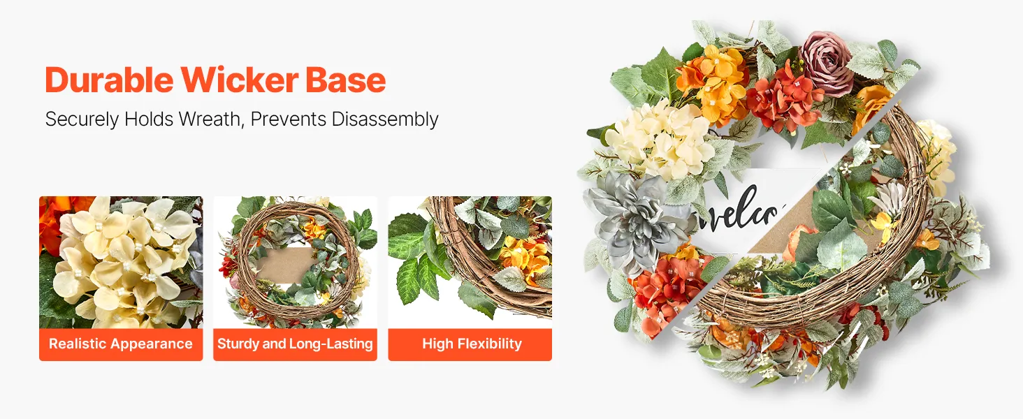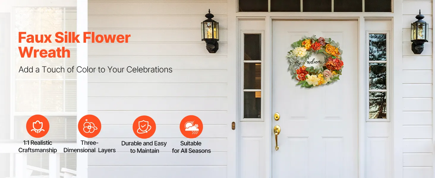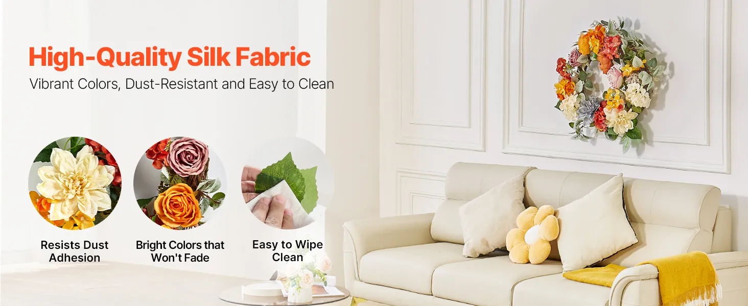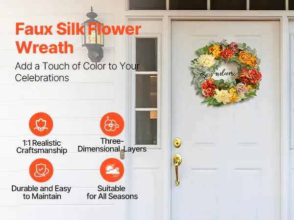 Hoogwaardige zijden stof: De bloemen van deze krans, die het hele jaar door gebruikt kan worden, hebben heldere, lang houdbare kleuren. Het materiaal is duurzaam, onderhoudsvriendelijk en lichtbestendig, waardoor het geschikt is voor langdurig gebruik. Het is zacht en ziet er realistisch uit.