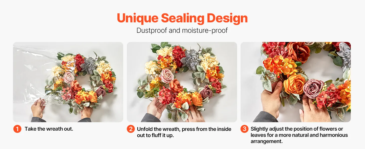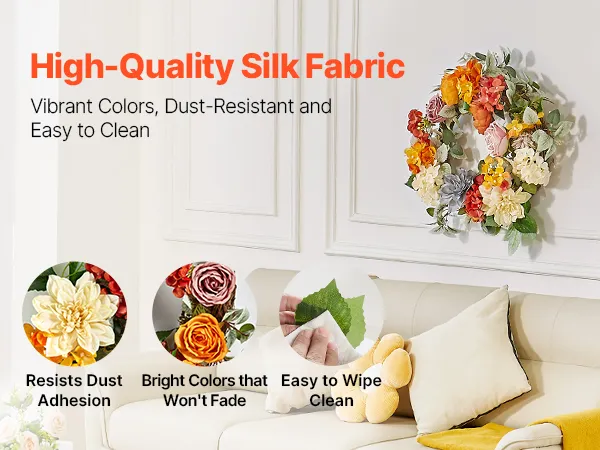 Deze voordeurkrans is gemaakt van hoogwaardige zijde, waardoor het oppervlak glad en stofbestendig is en de heldere kleuren behouden blijven zonder te vervagen na verloop van tijd. U kunt het voorzichtig afnemen of wassen met een vochtige doek.