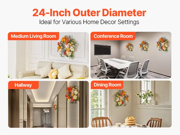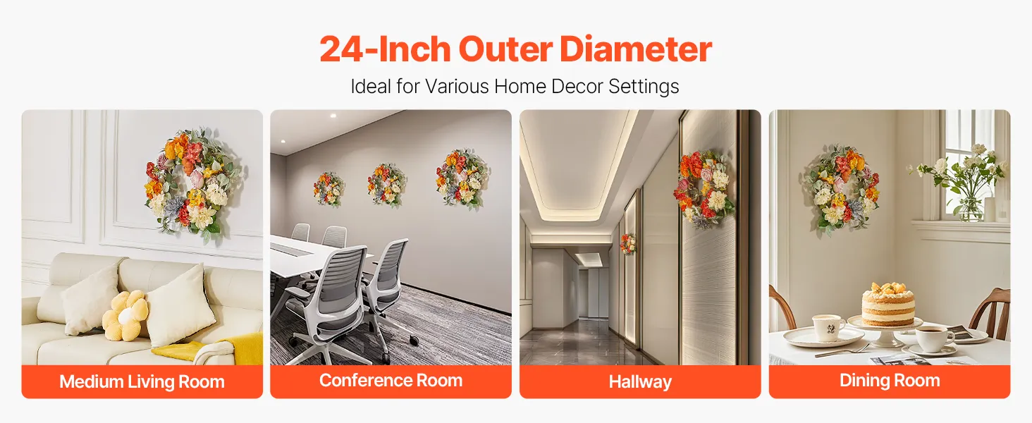 Met een buitendiameter van ongeveer 60 cm is deze kunstkrans ideaal voor het decoreren van middelgrote woonkamers, eetkamers, vergaderruimtes, gangen en andere ruimtes in huis. Hij voegt een vleugje natuurlijke elegantie toe aan uw huis.