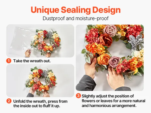 Haal de krans eruit en vouw hem open. Druk van binnen naar buiten. Strijk elke bloem en elk blad recht, zodat er een egaal en compleet uiterlijk ontstaat.
