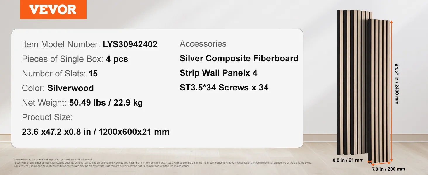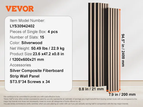 VEVOR Wood Slat Acoustic Panels, 7.9 x 94.5 inch, MDF Accent Wooden Wall Panels for Modern Interior Wall Decor, Faux Wood Wall Board Panels for Noise Reduction, Silver Wood VEVOR Wood Slat Acoustic Panels, 7.9 x 94.5 inch, MDF Accent Wooden Wall Panels for Modern Interior Wall Decor, Faux Wood Wall Board Panels for Noise Reduction, Silver Wood