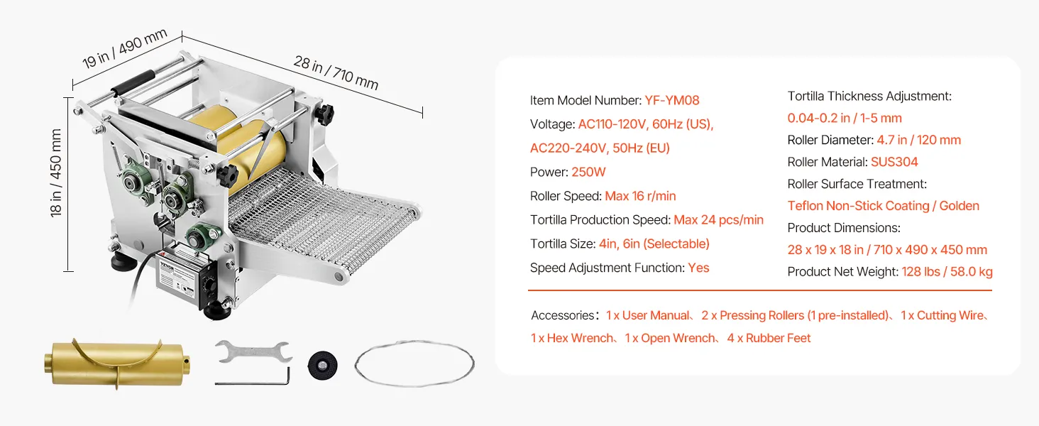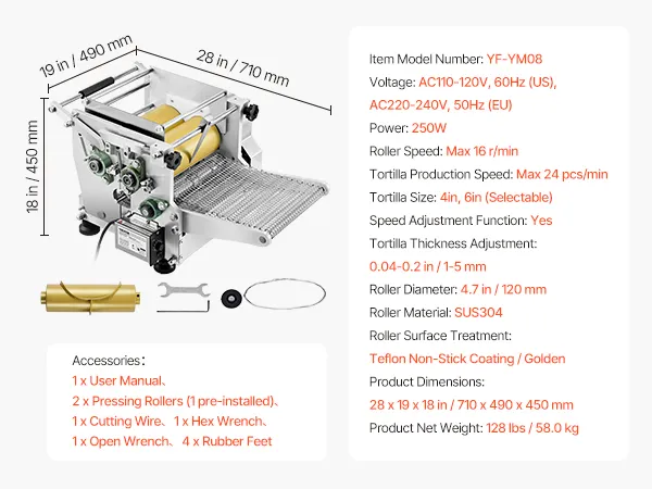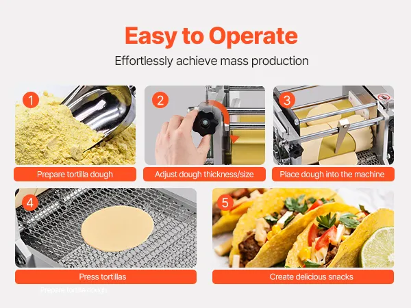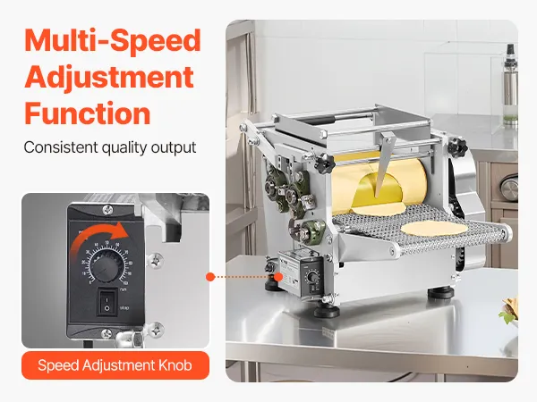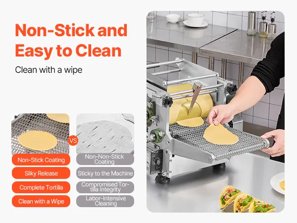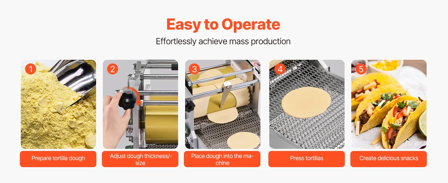 Durable & Long-Lasting: Designed for longevity, this tortilla maker is corrosion-proof and deformation-resistant. Its stainless steel rollers and conveyor system ensure reliable and clean performance.
