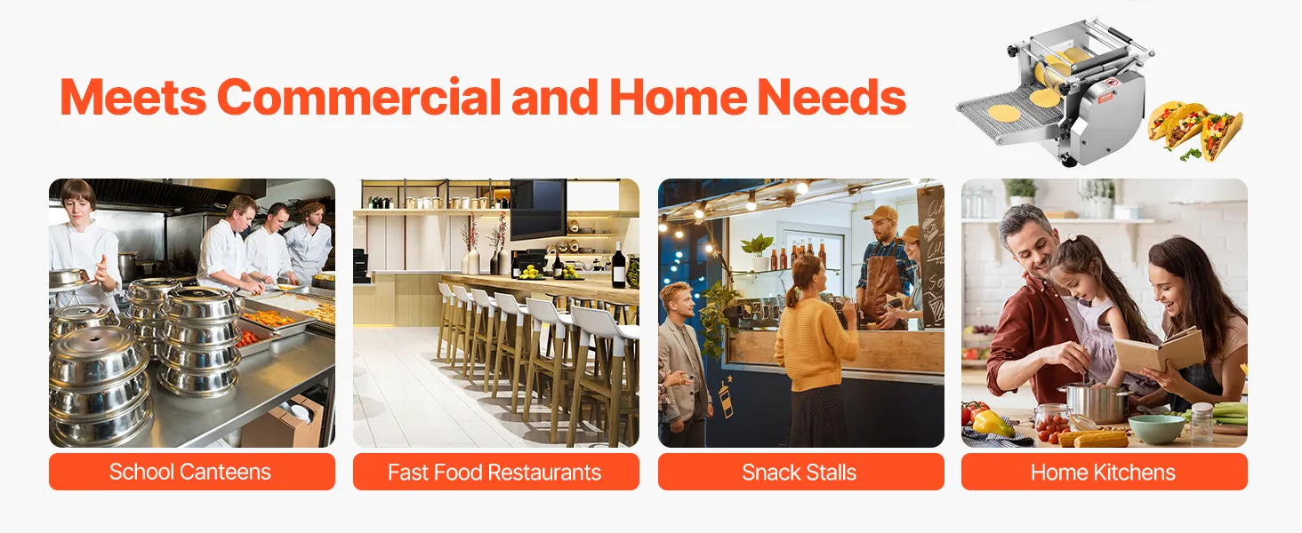 This tortilla machine isn't just for tortillas—it can also create Sopes, Gorditas, Roti, Pita, Tortilla Pizza, and more. Perfect for both home and commercial use, it fits various settings like homes, food trucks, fast-food shops, and school cafeterias.