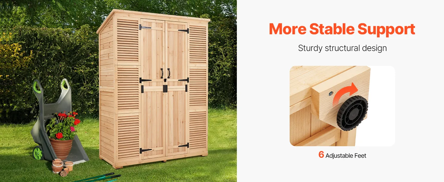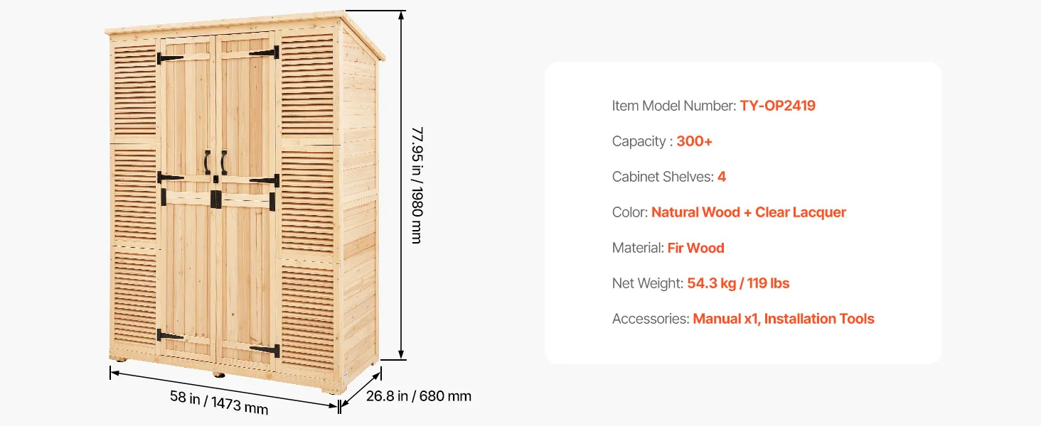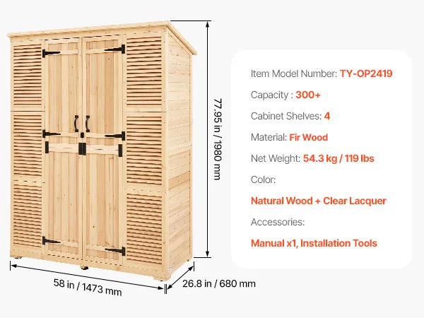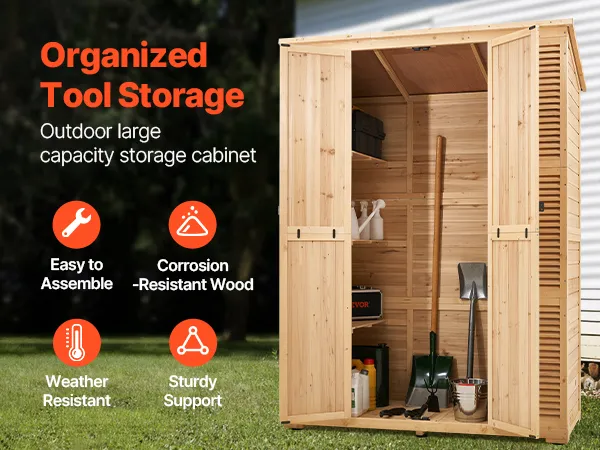 Stevige constructie: deze buitenopslag is gemaakt van hoogwaardig natuurlijk cederhout en behandeld voor uitstekende waterbestendigheid en corrosiebestendigheid. Het doordachte anti-tip-ontwerp voorkomt effectief dat de kast omvalt en zorgt ervoor dat deze bestand is tegen verschillende klimaatomstandigheden voor langdurig gebruik.