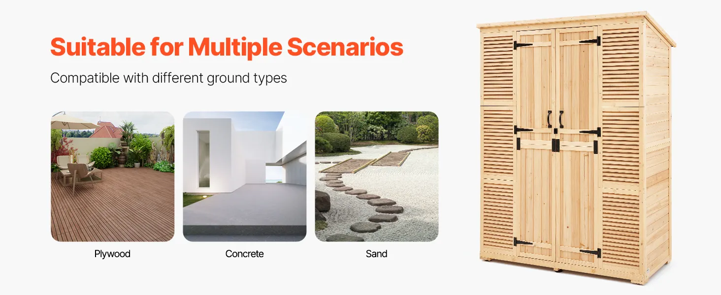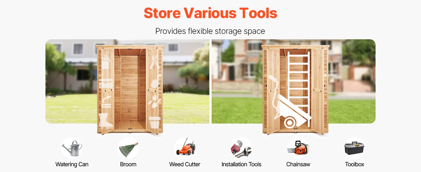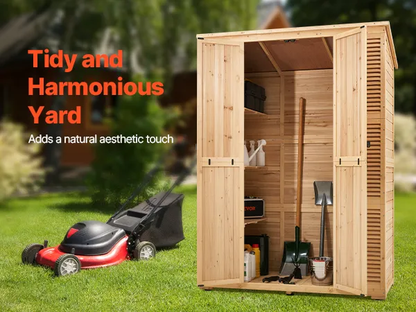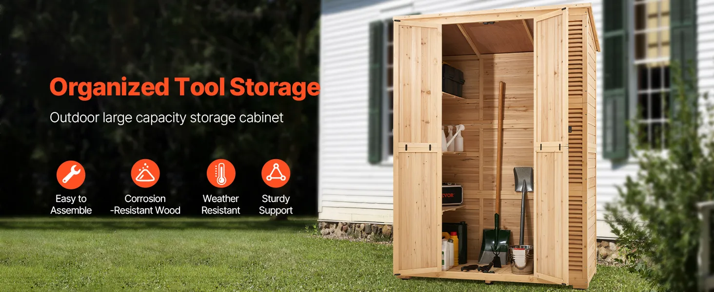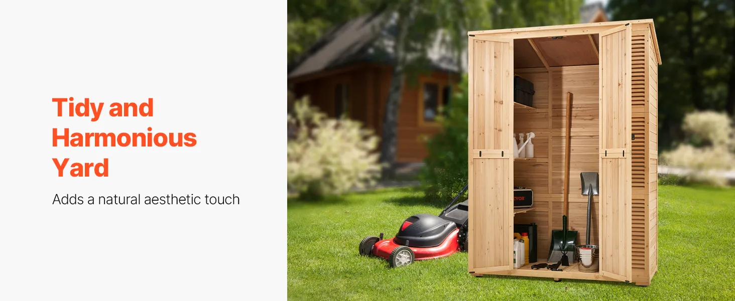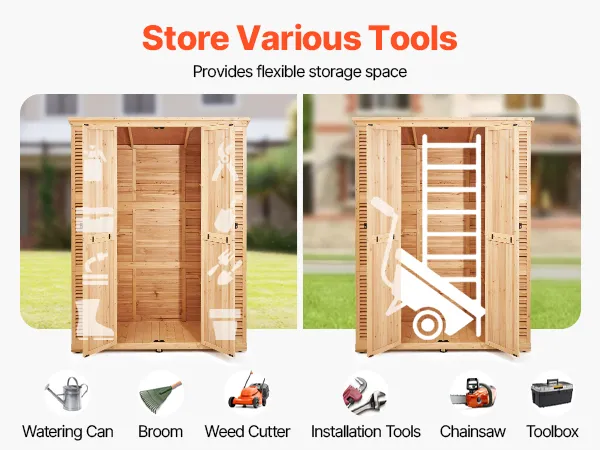 De grote houten buitenopslag is ontworpen met flexibele opslagruimte en biedt plaats aan een verscheidenheid aan gereedschappen, waardoor ze gemakkelijk te organiseren en snel toegankelijk zijn.