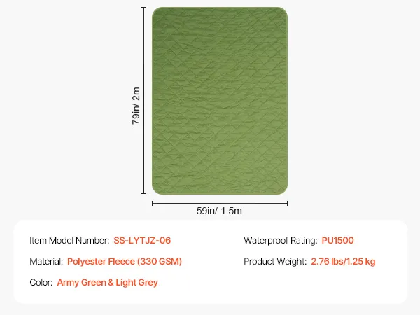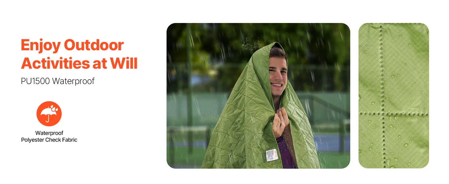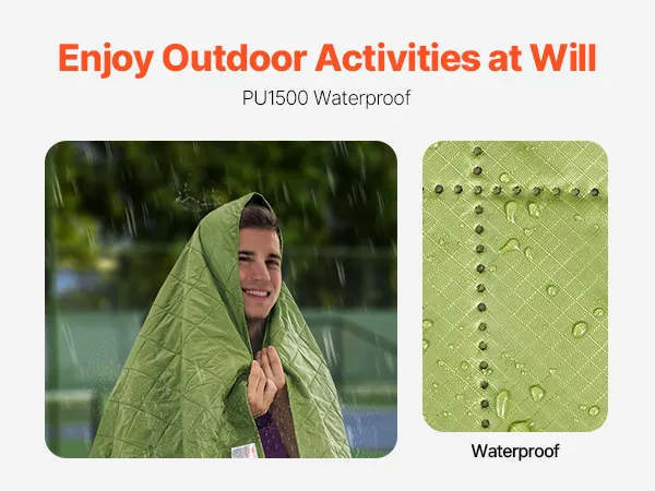 Waterdichte stof: deze kampeerdeken van waterdicht PU1500 polyester houdt je droog bij nat weer. Of je nu op het strand ligt, ontspant op het gras of een buitenevenement bijwoont, het voorkomt dat er water binnendringt en houdt je comfortabel tijdens je avontuur.