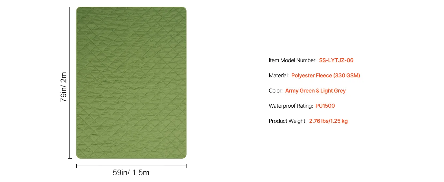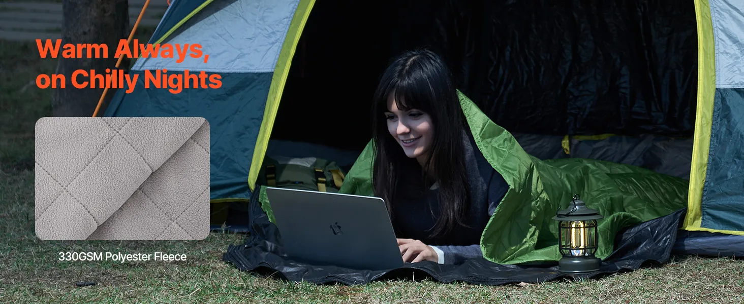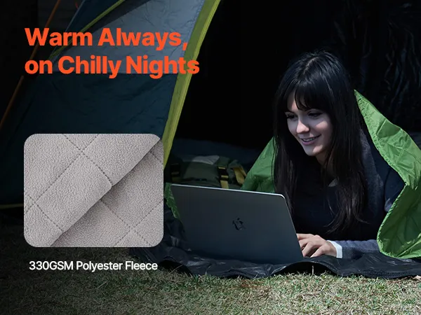 Geniet van het comfort van onze kampeerdeken gemaakt van dik 330GSM polyesterfleece. Dankzij de PU1500-waterdichtheid is hij bestand tegen wind en regen. Het ultrasone quilten zorgt voor een strakke pasvorm tussen twee lagen.