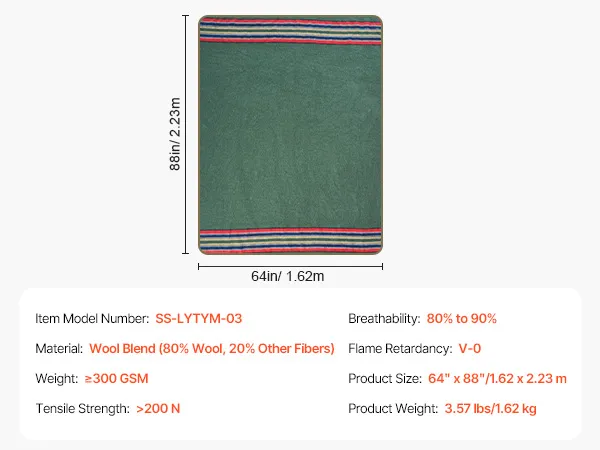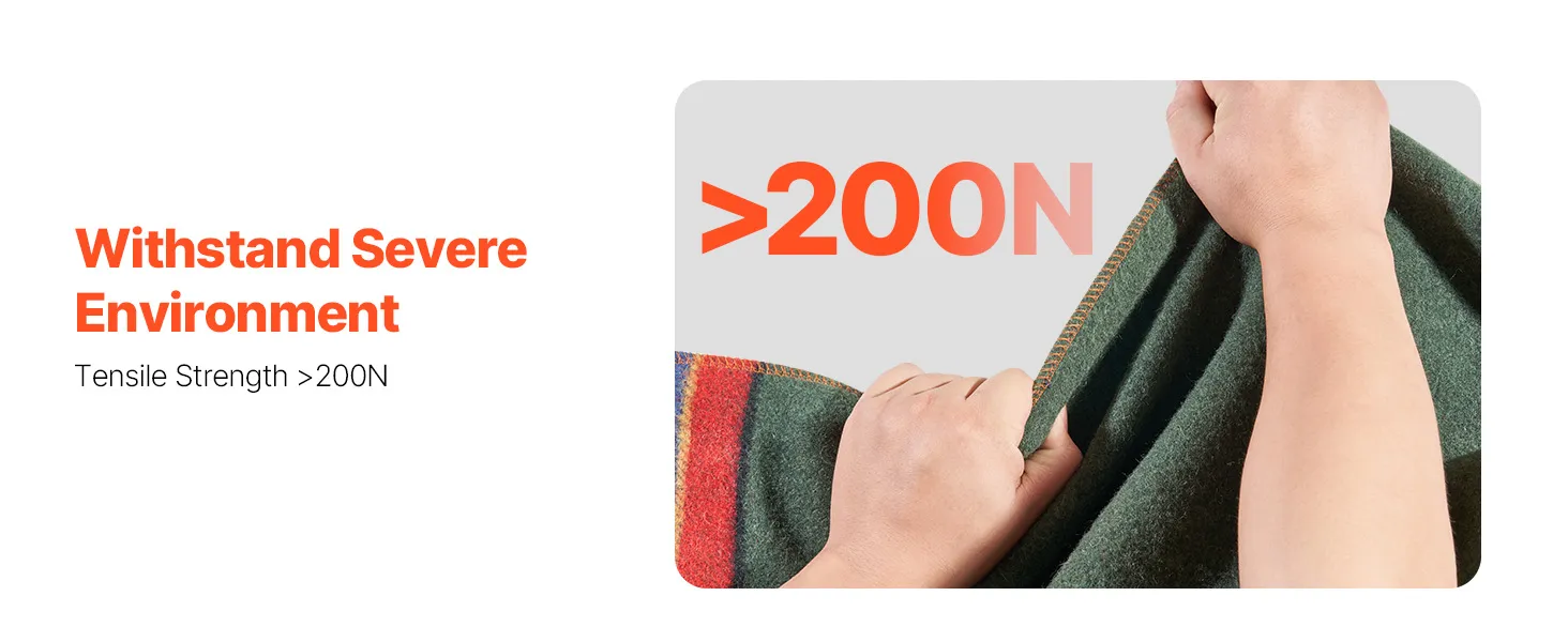 Deze wollen deken voor buiten is weerbestendig en heeft versterkte naden aan de randen met een treksterkte van meer dan 200 N. Of u nu gaat kamperen, wandelen of op verkenning gaat, het is een betrouwbare metgezel die bestand is tegen elke slijtage.