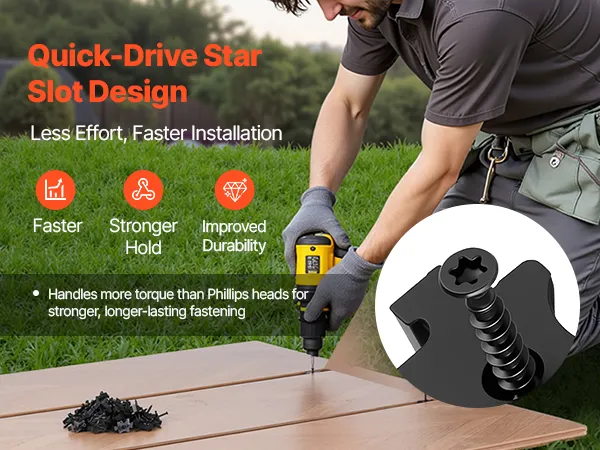 Deze verborgen terrasbevestigingen zijn voorzien van schroeven met steraandrijving en bieden een beter koppel, een betere grip en een ontwerp dat bestand is tegen manipulatie, waardoor het risico op schade aan schroefkoppen of gereedschap wordt verminderd.