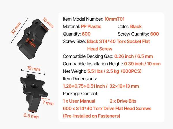 VEVOR 600x verborgen bevestigingen, afstandhouders voor vlonderplanken, universele composiet T-clips en kunststof bevestigingen met schroeven, geschikt voor plankafstanden van 6,5 mm en plankhoogte van 10 mm