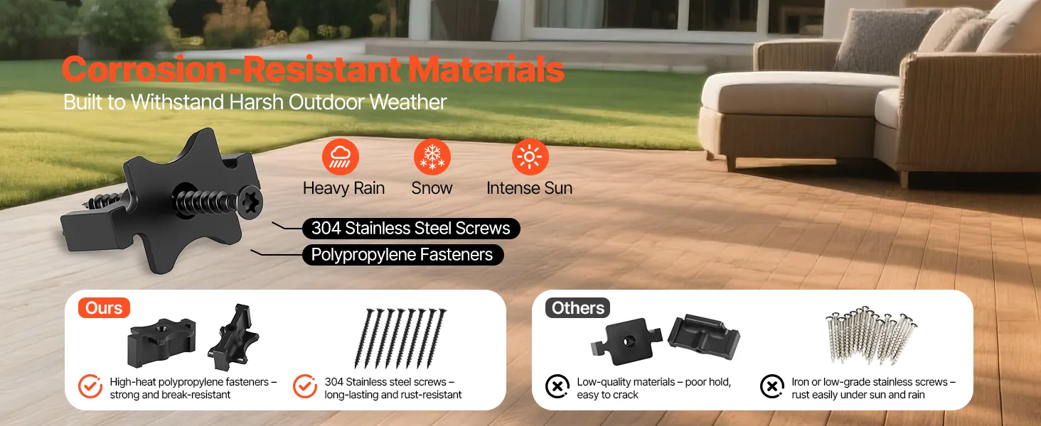 Snelle en eenvoudige installatie: het voorgeïnstalleerde ontwerp bespaart tijd en moeite, waardoor herhaaldelijk schroeven niet meer nodig is. Sterschroeven zorgen voor een betere grip en duurzaamheid, waardoor uw terrasproject sneller en veiliger wordt.